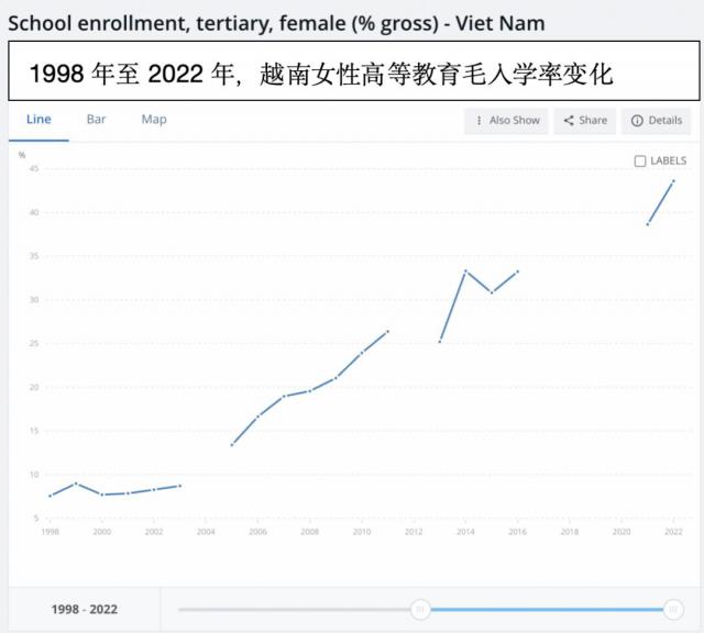 2022 年,越南女性高等教育毛入学率达到 44%,比十年前几乎翻了一番。